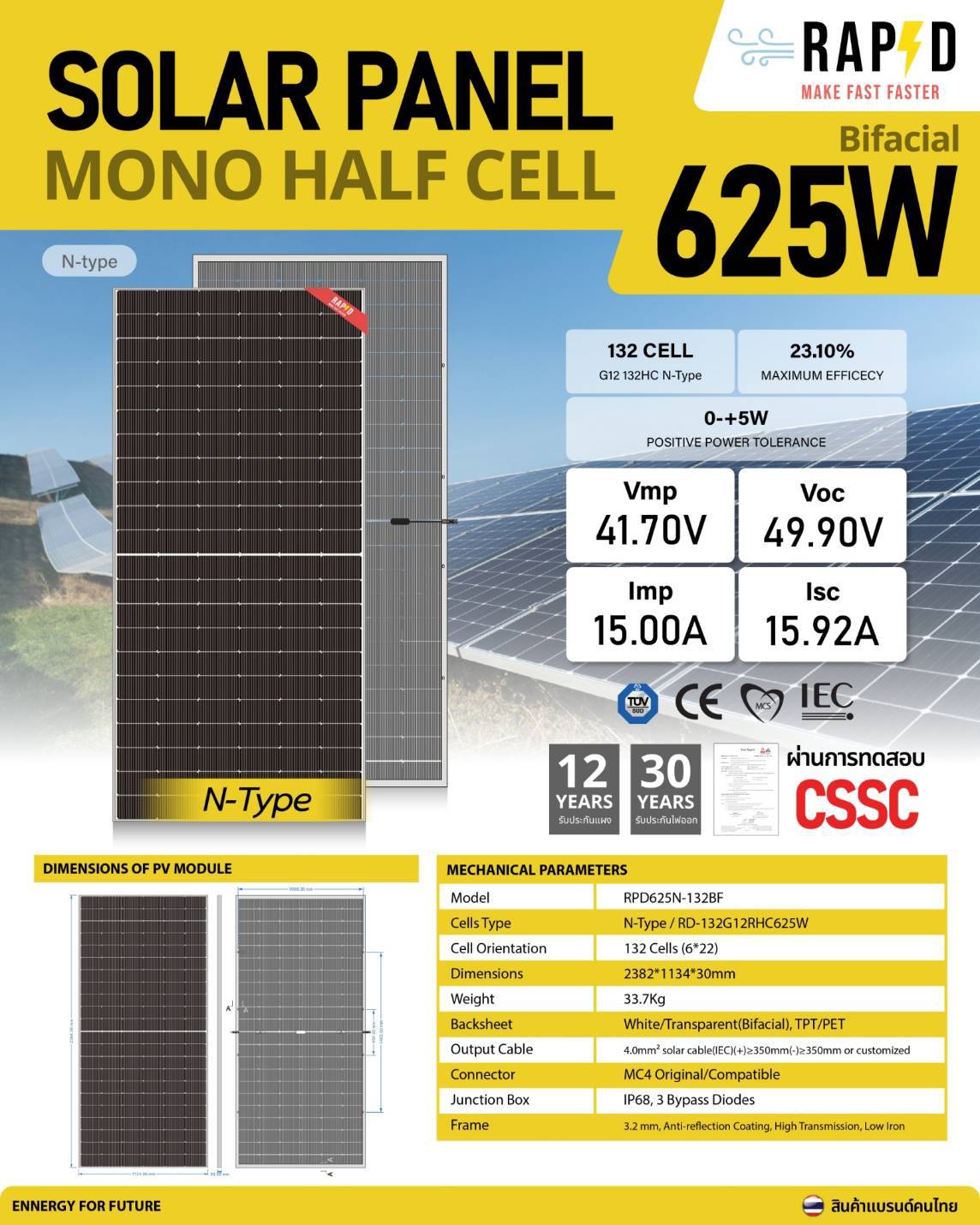 โดยรวมแล้ว แผงโซล่าเซลล์ RAPD 750W MONO N-Type เป็นตัวเลือกที่ทันสมัย ให้เทคโนโลยีระดับสูงในราคาที่จับต้องได้ ทำให้เป็นหนึ่งในแผงที่คุ้มค่าที่สุดในตลาดขณะนี้ครับ